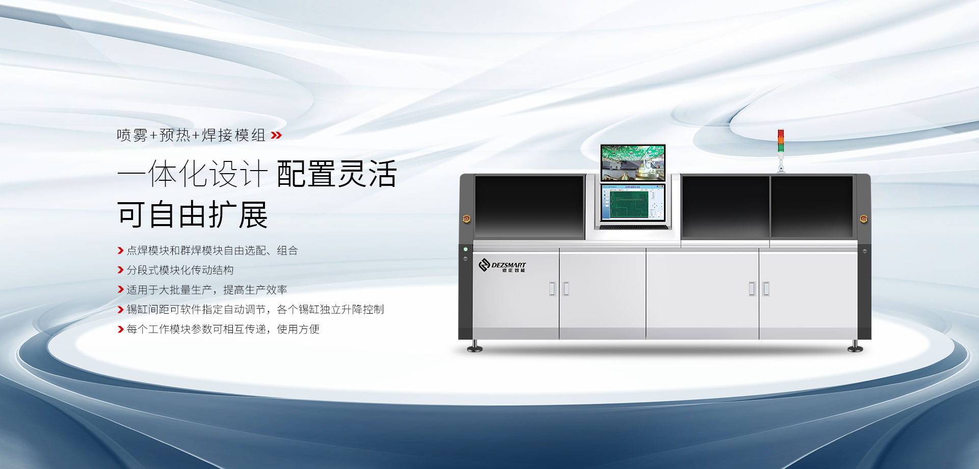 深圳市德正智能科技有限公司是一家專業從事自動化設備的創新型科技企業。公司擁有高素質、經驗豐富的研發人員,其核心團隊具有多年從業經驗,為各電子行業提供完整的整線自動化解決方案。公司目前主要針對整線自動化設備領域,在智能焊接、自動清洗、自動化檢測及非標自動化設備方面擁有完整的解決方案。德正智能產品廣泛用于航空、航天、汽車電子、智能手機、平板電腦、家用電器、工業控制、線束加工、LED及SMT等各個行業,客戶遍及華南、華東、華北、福建、西南、西北地區;產品出口到歐洲、臺灣、越南、印度、馬來西亞等地。德正智能以完整的產品線、廣泛的客戶群、穩定的產品性能獲得了眾多客戶的好評。德正智能全體員工將以“新技術,新服務,新發展”為理念,建立具有高水準的智能自動化系統。以環保節能、人性化、自動化為創新宗旨,不斷創造新產品,優化產品性能,實現全面質量管理架構。以誠信為本、互惠互利、全面的優良品質、永續經營的理念,···
